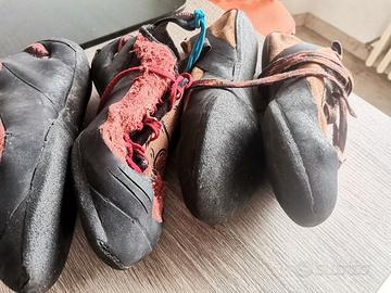 2 paia di scarpette usate, entrambe già risuolate: 1 paio di One Sport vintage anni '80-'90 (risuolate nel 2017) ed un paio di Wild Climb Pantera rosse con anche il puntale rifatto e tomaia esterna molto usurata (il laccio blu visibile in foto è stato tolto).