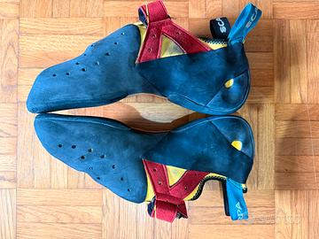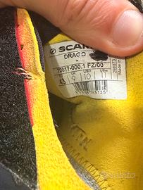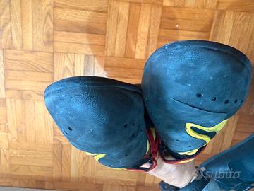 Scarpette arrampicata Drago. Usate pochissimo. Numero 43. Vendo perche vorrei cambiare modello e scendere di numero. Il puntino sull’etichetta l’ho fatto perche sono un modello di scarpa diffuso (oltre che tra i migliori) e serviva per riconoscerle in palestra al bisogno.