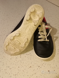 Con tacchetti. Marca Kipsta, colore rosso e nero, misura 29. Un po' consumate nella parte esterna della scarpa sinistra, ma ancora in buono stato.