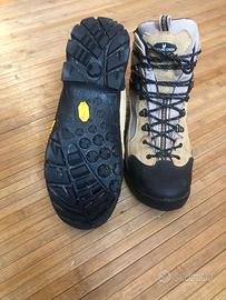 Scarponcini alti da trekking in pelle beige con protezioni in gomma nera, marca Grouse Greek taglia N. 40 per uomo o donna, adatti per camminare in sentieri in montagna con suola carrarmata, antiscivolo in vibram.