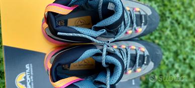 scarponcini trekking donna mod. Trango gtx La Sportiva, nr 40 1/2. Praticamente nuovi, usati 1 sola volta (10 km). Scatola originale, pagati €235,00. Vendo per un problema al piede che non consente più il trekking