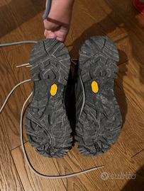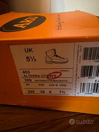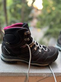 Scarponi trekking da donna AKU 403 GTX nuovissime in Gore-Tex, suola in Vibram, numero 39, usate 5 volte in totale (ho sbagliato numero), acquistate in negozio sportivo specializzato. Unico difetto: piccola abrasione posteriore scarpa dx (visibile nella foto posteriore) realizzata in una escursione su roccia. Suola pertetta. Pagate 220 euro.