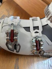 Scarponi da sci Nordica bianchi con imbottitura in pelo sintetico grigio, 4 leve di chiusura e strappo.