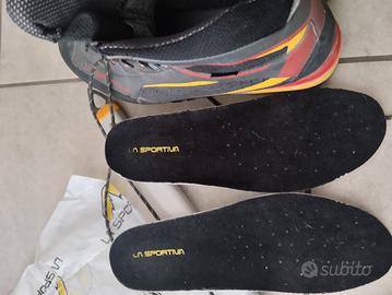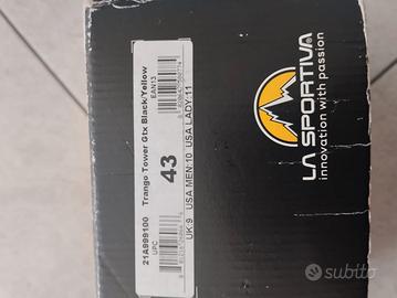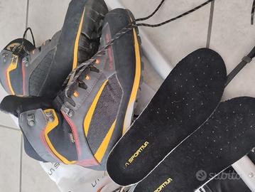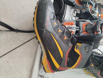 Scarponi ramponabili, La sportiva .n 43 suola in vibram Trango Tower Extreme GTX usati tre volte. Igienizzati, le solette originali non sono mai state usate, ho sempre usato solette personali . Tenuti molto bene. Eventuali segni di usura sono dovuti ai ramponi. Suole in vibram perfette Vendo perchè troppo larghi portando io un 41.