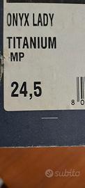 Scarponi da sci Dolomite taglia 24,5 da donna corrispondenti alla taglia italiana 38 / 39. Estremamente comodi. Adatti a sciatori di livello base e intermedio. Cinturino superiore in velcro e 4 ganci laterali regolabili. Usati molto poco (credo 5 volte) per raggiunti limiti di età.......