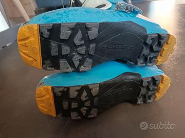 Scarponi scialpinismo La Sportiva Starlet Dotati di 2 ganci + velcro. Misura scafo 277 mm corrispondente a 25-25,5 oppure 39,5 / 40. Misura soletta interna alla scarpetta 24,5 cm. Peso 1050 g a singola scarpa. Usati con normale usura ma in buone condizioni sia le scarpette che le suole che hanno ancora parecchia suola. Visibili nei dintorni di Bormio o disponibile per la spedizione.