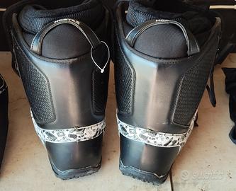 Questi sono scarponi da snowboard, Presentano una colorazione nera con dettagli bianchi e argento che richiamano un motivo grafico simile a quello visibile nell'immagine. Questo modello è noto per l'utilizzo della tecnologiaBOAper la chiusura, che permette una regolazione rapida e precisa tramite una rotella, visibile sul lato dello Usato 1 volta numero 48