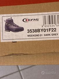 Scarponi trekking marca kefas, misura 46, in buono stato. Il modello unisex Weekend e' una scarpa hiking snella, dal look aggressivo ed innovativo, sicura su qualsiasi tipo di terreno, ideale per usi prolungati, facile da calzare. Tomaia in scamosciato idro e poliestere a trama rinforzata, allacciatura con originali passalacci smussati per un fitting perfetto senza attriti. Fodera in membrana BioDry full bootie, puntale in pelle gommata cucita, supporto posteriore e laterale a tenuta del tallone. Sottopiede estraibile, traspirante microforato con cuscinetto absorb sul tallone. Suola in Vibram e intersuola in microporosa con inserto stabilizzatore ammortizzante sul tallone.