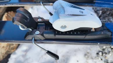 Sci Wedze (Decathlon) lunghezza 117 cm con attacchi, ideali per bambini e bambine dai 6 ai 9 anni circa.
