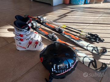 Sci bimbi 120 cm, usati per imparare quindi con quanche segno sulla soletta, con bacchette Head 85 cm, scarponi tg. 20-21,5 Head.
