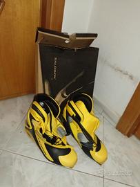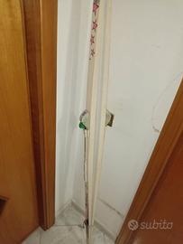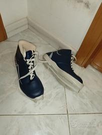 bastoncini. Gli sci Fischer con gli scarponi gialli Solomon (misura 42) sono da Skating (100 euro), gli sci Solomon con gli scarponi blu (misura 40) sono per tecnica classica (50 euro).