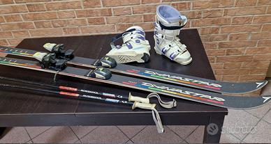 Sci discesa DYNASTAR Course lunghezza cm.168, larghezza minima cm.7; Attacchi M38 Twincam Markea; Scarponi BACHSTEIN Vlady Donna misura 23,5; Bastoncini ROSSIGNOL lunghezza cm.105