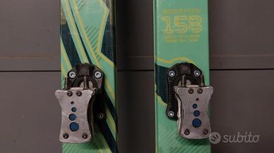 Sci da alpinismo Dynafit Broad Peak con attacchi Dynafit TLT speed. Lunghezza 158, forati per scarpone da 260 a 300 mm circa. Soletta con normali segni di usura, attacchi perfettamente efficienti e ben tenuti. In foto è montata piastrina artigianale alleggerita ma fornisco anche le originali nuove. Disponibili eventualmente pelli sagomate Pomoca Tour Pro usate 4 volte, perfette, a 90 €, disponibili bastoncini Skitrab ancora nel cellophane a 25 €, altezza 120.