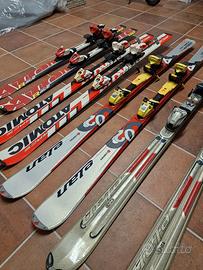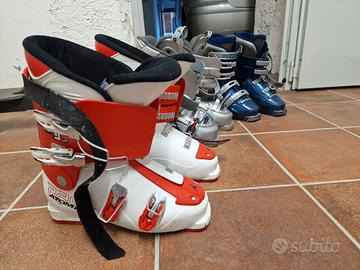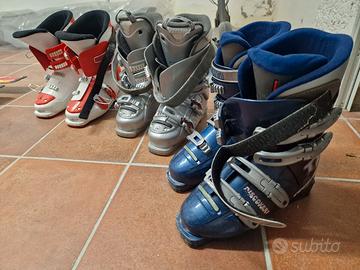 4 paia di sci, 3 paia di scarponi n. 40-41-41.5 2 caschi e un paio di racchette colore blu corte da bambino a euro 200.