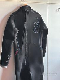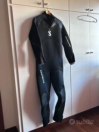 Usata solo 3 volte. La muta Scubapro Definition 7mm è un modello di alta gamma progettato per offrire calore e protezione in acque fredde (classe termica A, ideale tra 7°C e 12°C). Tradeinn Tradeinn +1 Caratteristiche Principali Materiale e Tecnologia: Realizzata in neoprene X-Foam, leggero, durevole e più ecologico poiché a base di calcare e privo di petrolio. Isolamento Termico: L'interno è rivestito in Infrared (IR), una fodera in pile che riflette il calore corporeo verso la pelle, aumentando il comfort termico. Vestibilità (Body Map System): Utilizza tagli e pannelli strategici (come l'Ultraspan sul petto e lo Stretchtec sul corpo) che permettono alla muta di aderire come un guanto, garantendo un'elevata libertà di movimento nonostante lo spessore. Design e Facilità d'uso: Cerniera diagonale posteriore YKK con cursore in ottone per una maggiore durata e facilità di chiusura autonoma. Polsini e caviglie con doppia cerniera, che facilitano la vestizione e assicurano una migliore tenuta stagna con guanti e calzari. Cerniera al collo per scaricare la tensione quando si è fuori dall'acqua. Rinforzi anti-abrasione su spalle, ginocchia e gomiti. Imbottitura dorsale per proteggere la colonna vertebrale dall'appoggio della bombola. Cinturini I-Safe su entrambe le braccia per fissare gli strumenti da polso (computer o bussola).