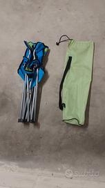 Sediolina da bambino a strisce verdi e blu, tipo pescatore richiudibule e dotata di sacca per il trasporto.