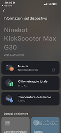 Vendo monopattino elettrico Ninebot KickScooter Max G30, uno dei migliori e più affidabili sul mercato. ✅ Meno di 1000 km reali (971 km) ✅ Batteria in ottime condizioni, autonomia elevata ✅ Sempre funzionato perfettamente ✅ Faro anteriore e luci ok ✅ Gomme ancora in ottimo stato ✅ Mai incidentato Il monopattino è tenuto molto bene, presenta solo normali segni d’uso (visibili in foto), niente che comprometta l’utilizzo. 💪 Modello MAX: Autonomia elevata (fino a ~60 km dichiarati) Molto stabile e robusto Perfetto per città e spostamenti quotidiani 📦 Inclusa scatola originale