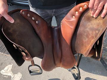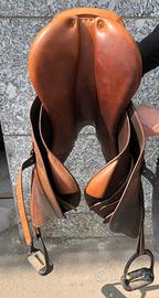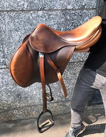 Sella Usata Salto Ostacoli misura 16" di Bruno Delgrange. Seggio medio. Colorazione: marrone, completa di staffili con le staffe leggere. In buone condizioni,