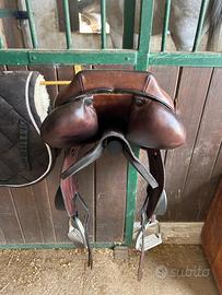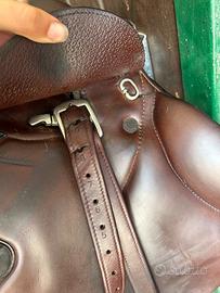 vendo sella Equiline modello cross con riscontri lunghi. Il cuoio è marrone con dettagli neri e targa Equiline argento, la misura della sella è 17. La sella è in ottime condizioni, gli unici segni presenti sono visibili in foto. Viene venduta compresa di alzapaletta incorporato nella sella e rimovibile in qualsiasi momento (poichè