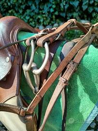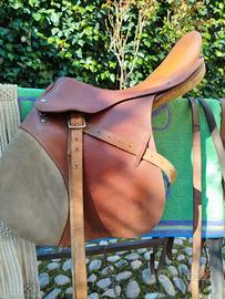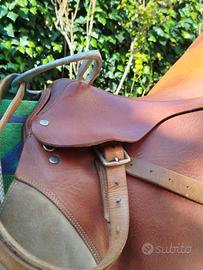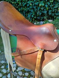 Sella equitazione monta inglese, tipo Pariani. In cuoio marrone chiaro. Completa di sottopancia e finimenti. Usata ma in buone condizioni.