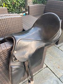 Sella inglese classica, colore nero, materiale pelle, quartieri ampi e rinforzati che garantiscono stabilità della gamba, marca "Daslo'. Condizioni: sella in buonissime condizioni.