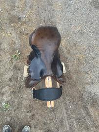 Sella inglese da salto vintage in vera pellq di alta qualita Macel mis 16 completa di staffe staffili sottopsncia e coprisella vendo x crescita di mio figlio e passaggio a sella argentina. Toppa su un lato causa piccolo strappo ..è un’ottima sella a libello qualitativo anche se usata