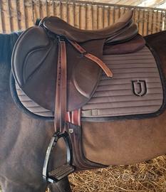 Vendo sella stubben Genesis da salto. misura 17.5. Seggio biomex. Arcione 31. Ci sono segni di usura che non compromettono l'uso. Si vende nuda.