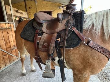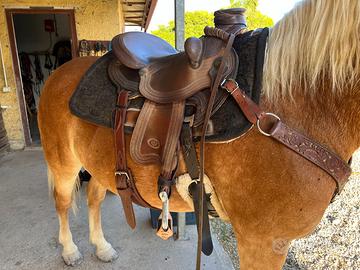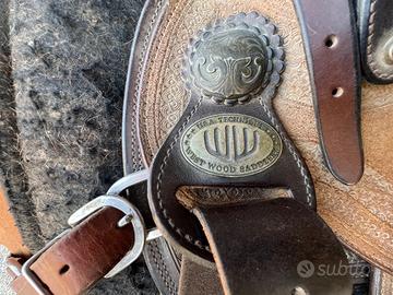 Sella Westwood modello Lady Wade seggio 15, dotata di bucking rolls, arcione misura Full Quarter, Staffili misura Youth (buchi fino al numero 17), parte esterna in cuoio rovesciato e interna in cuoio liscio dotata di staffe a panca larga e compresa di back cinch e anche staffe da Barrel in alluminio (montate gia sulla sella in foto e comprese nel prezzo della sella).