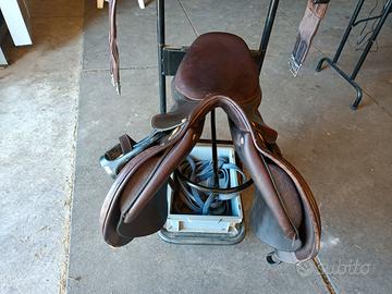 Per inutilizzo vendo sella da equitazione:- - sella da salto HERNRY DE RIVEL colore marrone scuro tgl. 18 € 750,00, completa di accessori (sottopancia colore marrone scuro tgl. 125, testiera COB nera, pettoraale nero, sottosella nero, cuscino salva garrese).