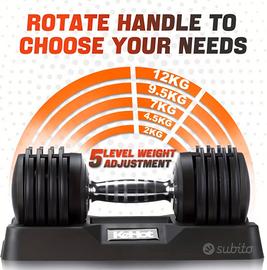 Manubri Regolabili Tutto in Uno | Design a Peso Variabile 5-in-1 fino a 12kg. Migliora la tua palestra domestica con questi manubri regolabili 5 in 1, progettati per un allenamento della forza efficiente, tonificazione muscolare e modellazione del corpo. Con un innovativo sistema di regolazione del peso a un tocco, puoi passare istantaneamente tra i livelli di resistenza per allenamenti più veloci e intelligenti a casa