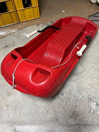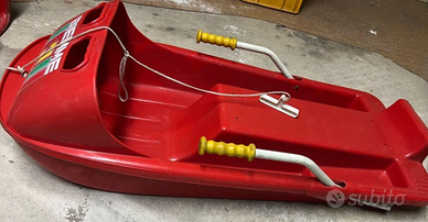 Vendo due slittini Bob Biemme rossi, modello vintage, perfetti per divertirsi sulla neve! Design classico con leve laterali per la sterzata e corda anteriore per il traino. Ideali per bambini. In buone condizioni generali, con normali segni di utilizzo.
