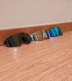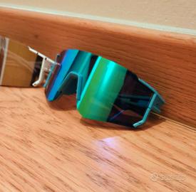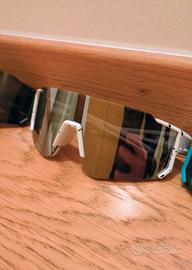 Questi occhiali da sole sportivi presentano un design a mascherina moderna e aerodinamica, caratterizzato da una lente unica di grandi dimensioni che offre un ampio campo visivo e una protezione ottimale dal vento. La montatura è leggera ma robusta, con linee geometriche decise che seguono la curvatura del viso. Sono disponibili in tre varianti cromatiche: una versione con lente a specchio azzurro-iridescente e montatura coordinata, una versione con lente specchiata argento e montatura bianca con dettagli neri punteggiati, e una versione classica "total black" con lente scura fumo. Grazie al loro stile dinamico, sono ideali per attività all'aperto come il ciclismo o il running, unendo funzionalità tecnica e un'estetica d'impatto.