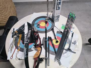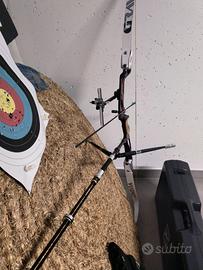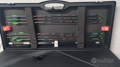 il set comprende: Riser: PSE 25" ILF colore bordeaux. Già equipaggiato con Rest e Bottone Spigarelli e Clicker nuovo. Flettenti: Omega Gravity 68" - 28 lbs (trazione fluida e costante). Mirino: WNS , preciso e affidabile. Stabilizzazione: Set completo (Centrale 30", Laterali 10") con V-Bar regolabile e Prolunga (nuova). Frecce: 12 frecce Avalon Tyro spine 800, complete di cocche e punte. Accessori: Cavalletto poggia-arco, corda, patella, paraseno, dragona, carichino, estrattore frecce, parabraccio. Trasporto: Inclusa valigia rigida professionale con ruote e scomparti interni per la massima protezione.