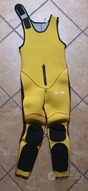 •Descrizione: Una muta in neoprene senza maniche (stile salopette) con rinforzi neri sulle ginocchia.