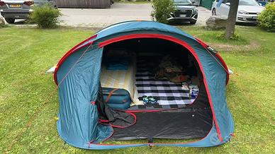 Vendo set campeggio completo Decathlon, usato solo due volte, come nuovo, senza rotture né muffe. Lista articoli e prezzi originali: • Tenda rapida Quechua 3 posti: 84,99 € • Sedia pieghevole: 17,99 € • Compressore d’aria portatile: 54,99 € • Struttura letto gonfiabile: 79,99 € • Materassino a nido d’ape: 17,99 € • Materasso sottile gonfiabile: 24,99 € • Tappeto tenda: 19,99 € • Cuscino gonfiabile piccolo: 5,99 € • Martello da campeggio: 5,99 € Totale originale: 312,91 € Tutto in ottime condizioni, pronto all’uso, ideale per chi vuole iniziare a campeggiare senza spendere troppo. Consegna possibile nella zona Milano/Lombardia. Prezzo NON trattabile.