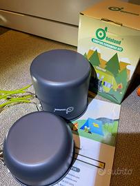 Set da cucina pieghevole antiaderente per avventure all'aperto. Include 2 utensili in alluminio, borsa per il trasporto. Resistente e leggero, con manici pieghevoli.