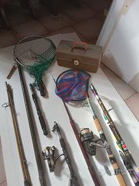 Formato da N.10 canne da pesca telescopiche di vari formati, con mulinelli e lenze, cassetta con accessori, ami, piombi, 2 retini e sacche per il trasporto.