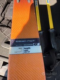 Sci Salomon, racchette Scott, guanti da sci Salomon in GoreTex, scarponi e occhiali da sci, utilizzati pochissimo.