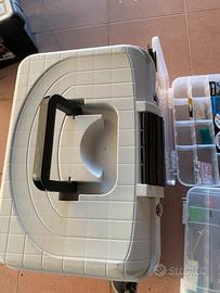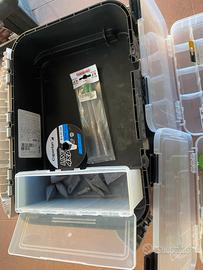 Vendo cassetta da pesca Caperlan BX 4 D (24,4L) completa di 4 scatole modulabili. Include un vasto assortimento di attrezzatura: bobine di filo Caperlan Line 4x4, numerosi pacchetti di ami montati per mare e acqua dolce, galleggianti e minuteria varia. Ideale per chi cerca un kit pronto all'uso e ben organizzato.