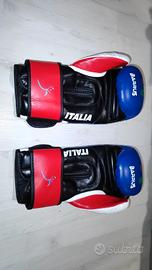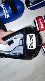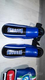 Set completo protezioni sport da combattimento nuove, comprende paratibie, parapiedi, casco e guanti 10oz, tutte le protezioni sono taglia L.