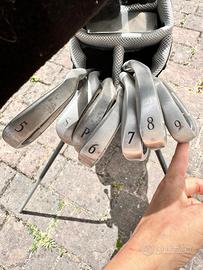 Set da Golf con 10 pezzi completo e perfetto per uso da principiante o livello medio. Ha tutte le mazze fondamentali, dai legni 3 e 5 fino al putter passando per i ferri comprensivi di pitch e sand. Usato pochissimo per prendere le prime 8/10 lezioni e poi custodito in garage e non più utilizzato.