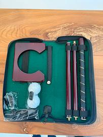Ecco cosa si vede nella custodia: Le aste smontabili che formano un putter (la mazza da golf) L’impugnatura (grip) del putter Due palline da golf Una struttura a forma di “C” che funge da raccoglipalla / bersaglio, spesso usata per far tornare indietro la pallina quando imbuchi Piccoli accessori (probabilmente tee o supporti)