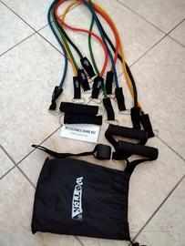 Set di elastici, cavigliere e maniglie per allenamento a corpo libero completo. Gli elastici possono essere usati singolarmente o man mano accoppiati per aumentare progressivamente la resistenza e quindi il carico da un minimo di circa 4kg ad un massimo di circa 70kg. Set pari al nuovo, regalo inutilizzato.
