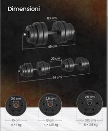 Peso totale con accessori: 30 kg, inclusi 8 pesi da 2,5 kg, 4 pesi da 1,25 kg, 4 pesi da 1 kg, 2 barre per manubri corti, 4 chiusure a stella e una barra per bilanciere per 2 manubri da 15 kg o un bilanciere da 30 kg