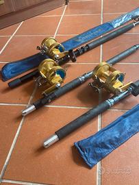 Per inutilizzo cedo set di attrezzatura composta da 3 mulinelli Italcanna Gladiator 4/0 Made in Italy perfetti, regolarmente revisionati dalla casa madre , 2 canne in carbonio Falcon Black Phantom Superacid 50 libbre anellate Fujj Japan ed 1 canna in carbonio Atc Battleship 30/50 libbre anellata Sic.Aggiungo 3 bobine di trecciato da 822 metri cadauno marca Shimano sufix top shot pro 0,35 80 libbre multicolor,bobina da 68 mt di fluorocarbon Berkley 0,91 mm 80 libbre, confezione di ami circle con girella,set di manicotti in alluminio Tubertini di varie misure e pinza crimpatrice Colmic;attrezzatura in condizioni impeccabili, viene venduta IN BLOCCO, pronta all’uso, ideale per drifting e/o traina d’altura al tonno rosso, pesce spada e grandi pelagici .Per intenditori e competenti.Eventualmente disponibile anche cintura da combattimento Italcanna e giubbino con harness Sardamatic e raffio Normic ed altro combo composto da canna carrucolata Aftco U.S.A. stund up 20/50 libbre con Gladiator 4/0 gemello agli altri.Per ricerca e visibilità Alutecnos, Sunrise, Artico,Everol, Normic,Accurate,Penn.