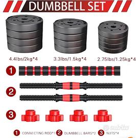 Componenti: Include 2 manubri, 1 barra di collegamento, e vari dischi di diverso peso (2 kg, 1.5 kg, 1.25 kg, 0.5 kg).