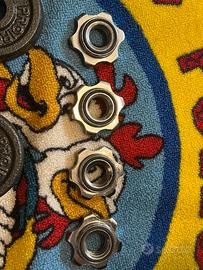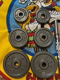Come nuovo usato poco Il set comprende: •2 barre manubrio filettate •barra di collegamento per trasformarlo in bilanciere •4 ghiere a stella per bloccare i pesi •dischi in ghisa per un totale di 17 kg suddivisi in 4 piastre da 2,5kg, 4 piastre da 1,25kg e 4 piastre da 0,5 kg. Perfetto per allenamento home gym, braccia, petto, spalle, schiena e gambe