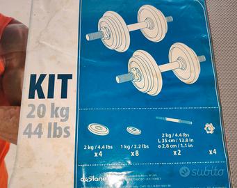 Come da titolo vendo per completo inutilizzo i seguenti articoli : - un kit con valigetta contenente 2 manubri e 20 Kg di pesi ( 4 dischi da 2 Kg + 8 dischi da 1 Kg + 4 dadi filettati per serraggio pesi ) . I manubri pesano 2 Kg ciascuno e la valigetta è comoda e facile da trasportare. - Un bilanciere dritto lunghezza 120 cm Ø 28 mm ( peso circa 5 Kg ) senza clip di fissaggio pesi. - Un bilanciere curvo lunghezza 120 cm e Ø 28 mm ( peso circa 5 Kg ) con 2 dadi filettati per serraggio pesi. - Altri 2 dischi da 2 Kg e 4 dischi da 1 kg . Normali segni di usura ma perfettamente utilizzabile. Visto il peso non spedisco - Solo consegna a mano in asti e zone limitrofe in un raggio di 25 Km. Eventualmente è disponibile anche una panca inclinabile regolabile ( vedere sezione dei miei annunci ) Do massima serieta' e pretendo massima serieta'.