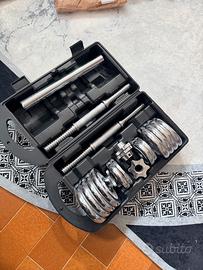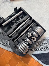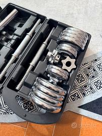 Set manubri cromati da 15 kg – completo di accessori Set composto da manubri regolabili in acciaio cromato, ideale per allenamento domestico e palestra. Struttura solida e resistente, progettata per durare nel tempo. Contenuto del set: •2 barre filettate in acciaio cromato con impugnatura zigrinata antiscivolo •Dischi cromati di diversi pesi per un totale di 15 kg •4 ghiere di sicurezza a vite (spinlock) per il fissaggio dei pesi •Barra di collegamento (utilizzabile come bilanciere corto, se presente) •Valigetta rigida per il trasporto e la conservazione Caratteristiche: •Materiale: acciaio cromato di alta qualità •Sistema regolabile per adattare facilmente il carico •Impugnatura ergonomica per maggiore sicurezza e comfort •Facile da montare e smontare Ideale per esercizi di potenziamento muscolare: braccia, spalle, petto e schiena. Perfetto sia per principianti che per utenti avanzati.