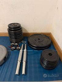 - 2 dischi da 10kg , 2 dischi da 10 kg per gambe, 12 dischi da 2 kg, 8 dischi da 1 kg